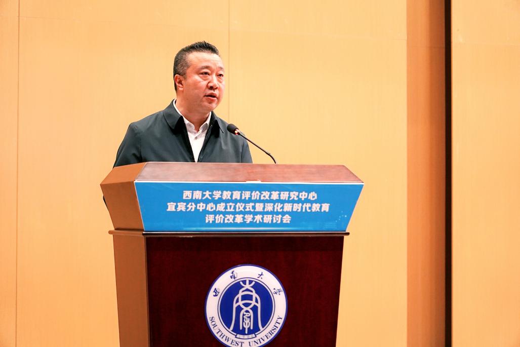 会议第一阶段宜宾分中心成立仪式由学校发展规划与学科建设部副部长杜彬恒主持。田贵荣在致辞中对宜宾分中心的成立表示热烈祝贺,他指出宜宾分中心的成立,将为宜宾教育评价改革实践提供强有力的智力支持和决策参考,将为宜宾基础教育高质量发展注入新的动力。